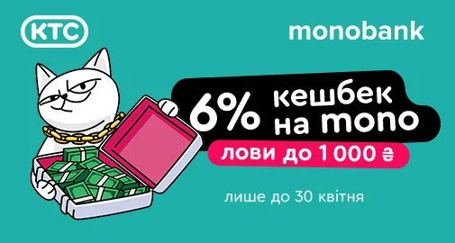 Максимум вигоди, круті враження! Даруємо 6% кешбеку при оплаті карткою mono в магазинах КТС або сайті ktc.ua.