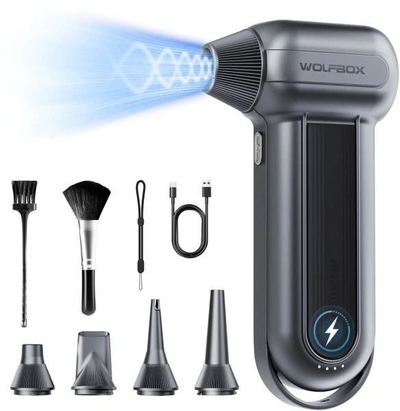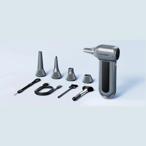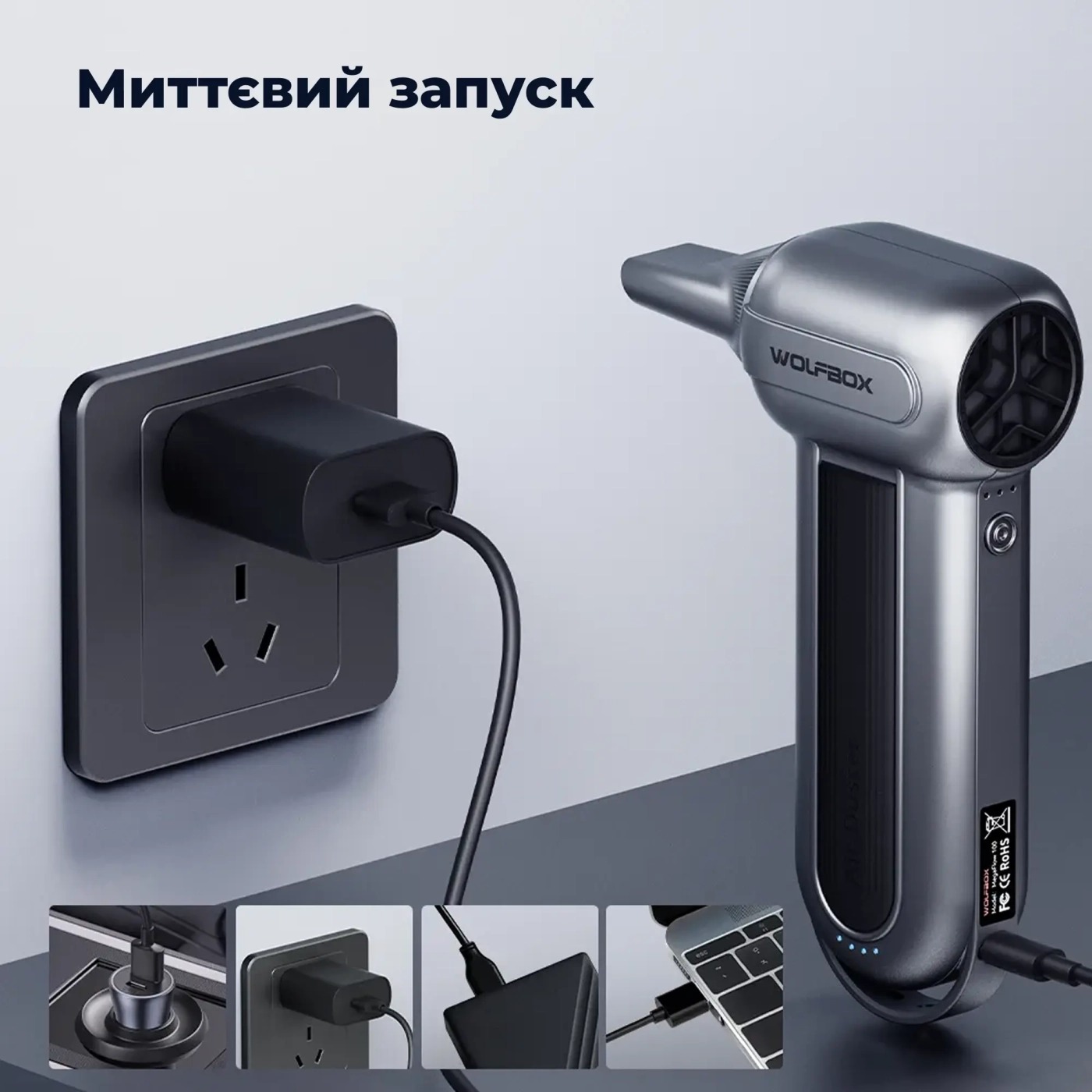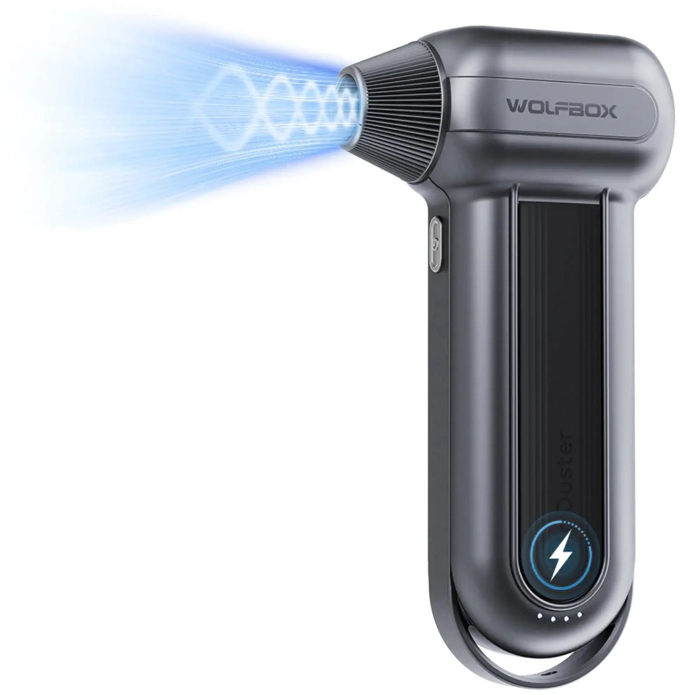 Акумуляторний турбокомпресор Wolfbox MegaFlow 100 — це компактний і потужний пристрій, який стане незамінним помічником для швидкого та ефективного очищення. З турбовентилятором, що розганяється до 150 000 обертів на хвилину, він створює повітряний потік зі швидкістю до 45 м/с і об'ємом 70 CFM, дозволяючи легко видаляти пил, сміття та бруд навіть у важкодоступних місцях.