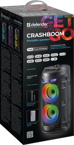 Defender Crashboom вирізняється можливістю True Wireless Stereo (TWS) для сполучення двох колонок у стереорежим, що ідеально для вечірок чи домашнього використання. У комплекті йде все необхідне: ремінь, кабелі Type-C та AUX, дротовий мікрофон, пульт і інструкція. Ця колонка не просто грає музику — вона створює атмосферу, роблячи кожен момент яскравішим.