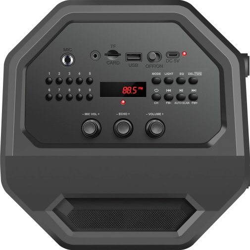 Колонка підтримує відтворення з USB і Micro-SD до 64 ГБ у форматах MP2, MP3, APE, FLAC, WAV, WMA, з пам’яттю останнього треку. Вбудований FM-приймач і AUX-вхід розширюють можливості, а мікрофонний вхід 6.3 мм з ефектом відлуння ідеальний для караоке. Світлодіодна підсвітка з трьома режимами та бездротовий пульт ДК додають зручності та атмосфери.