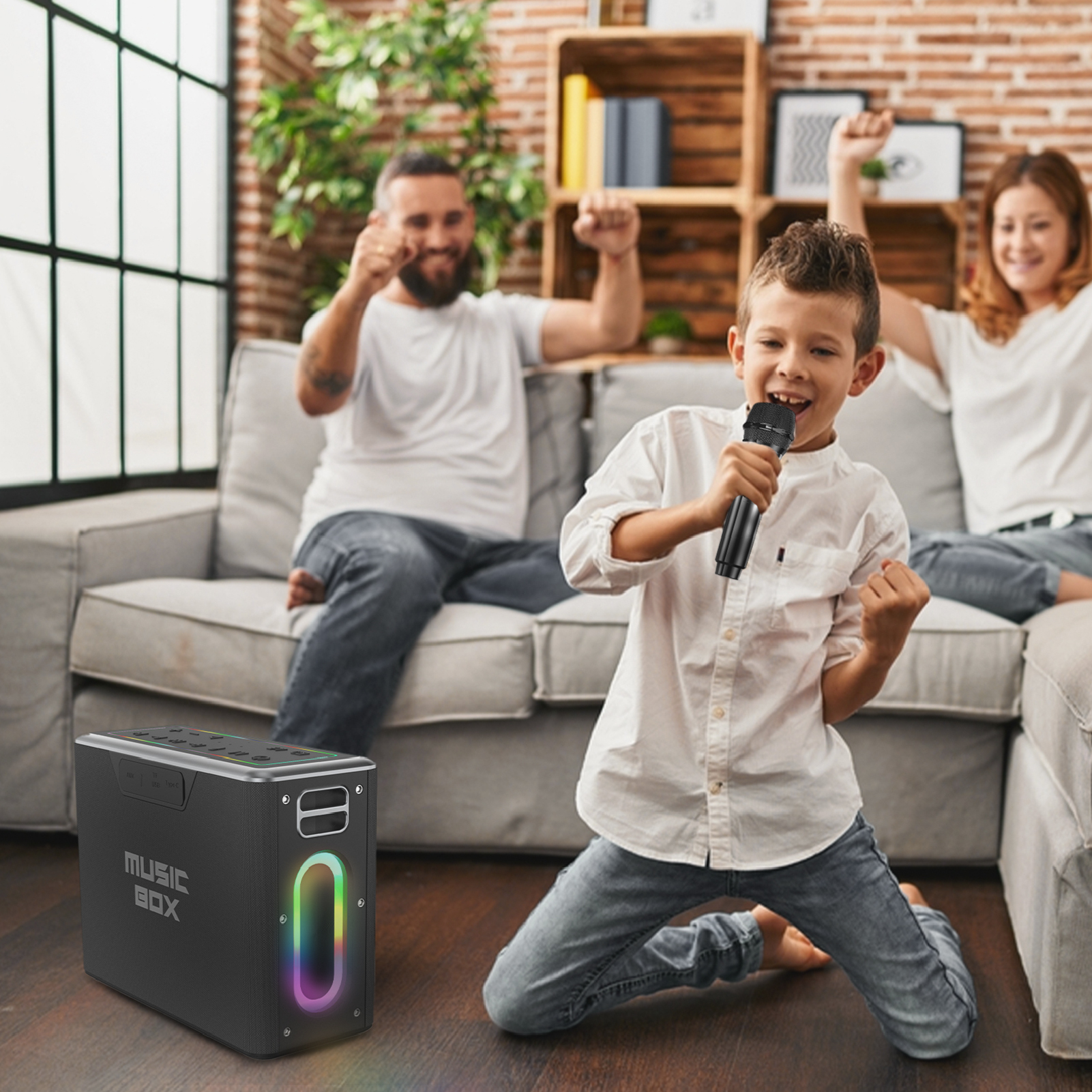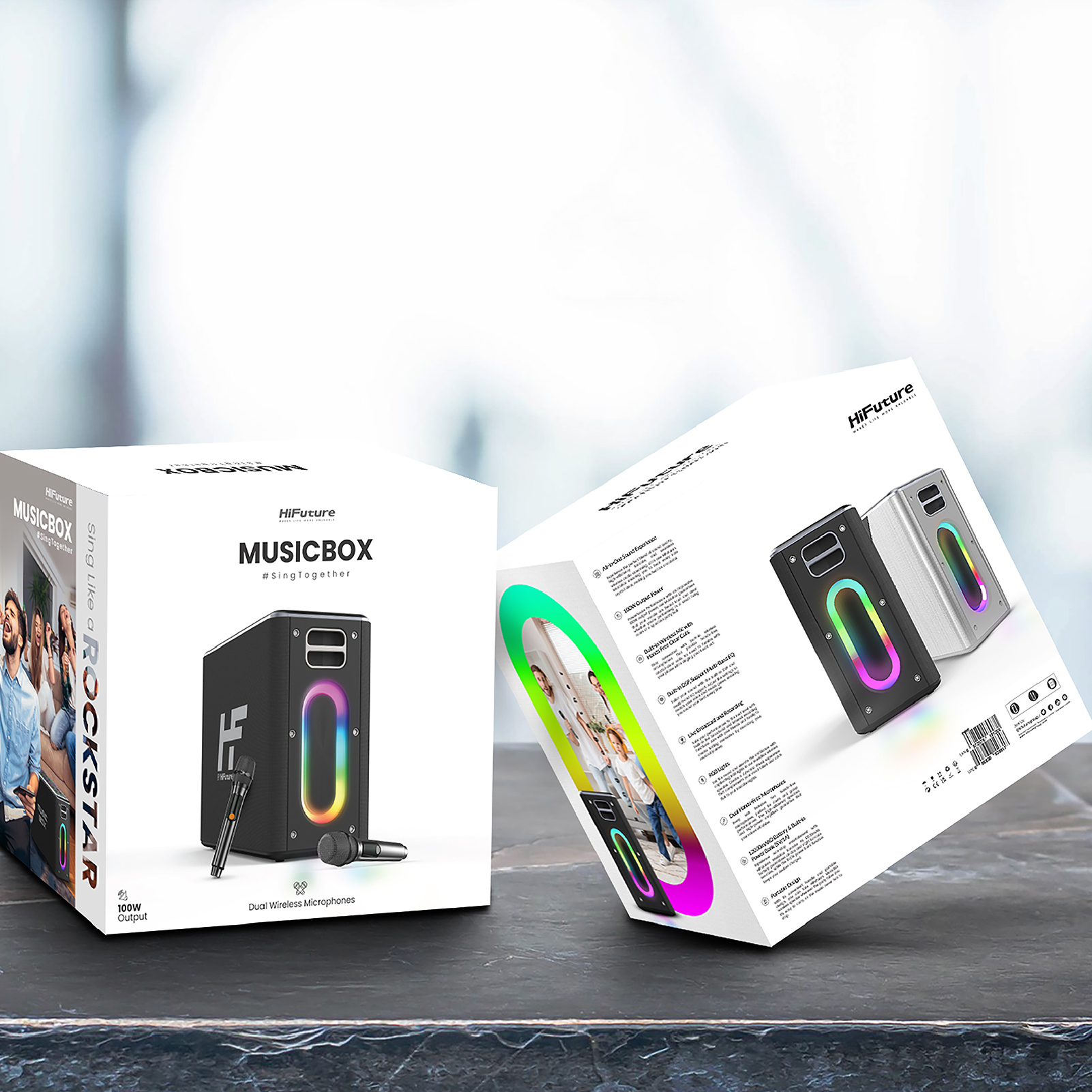 MusicBox від HiFuture — портативна колонка, створена для крутих денс паті та вокальних батлів. Чотири динаміки сумарною потужністю 100W, система караоке з двома мікрофонами та динамічна RGB-підсвітка.