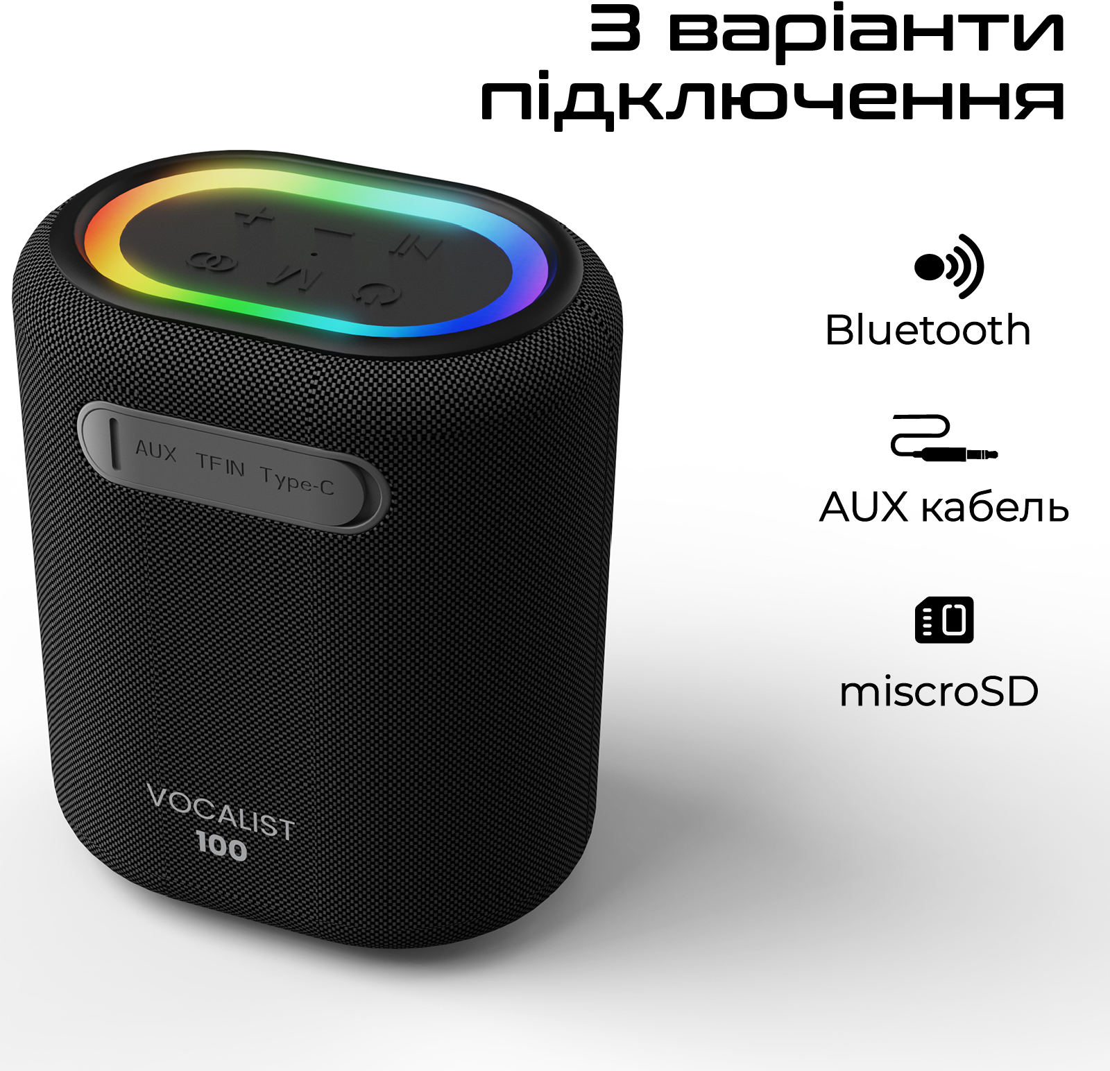 Vocalist100 — портативна колонка з нової лінійки від HiFuture. Режим караоке з комплектним мікрофоном, стильне підсвічування та велика автономність для твоїх вечірок.