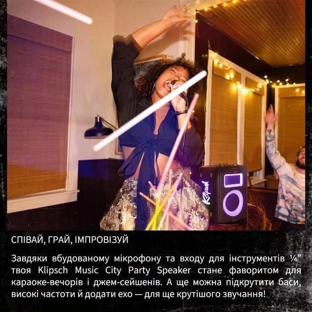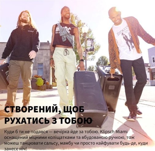 Вечірка триває стільки, скільки потрібно: до 18 годин автономної роботи без підсвітки або 10 годин із повним світловим шоу. Захист від бризок IPX4, мікрофон у комплекті, вхід для інструментів, функція Party Link для об’єднання кількох колонок, Bluetooth 5.2 та класичний AUX — усе це робить Klipsch Miami ідеальним компаньйоном для караоке, джем-сейшенів, імпровізацій та найгарячіших ночей.