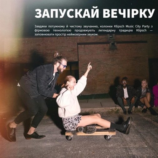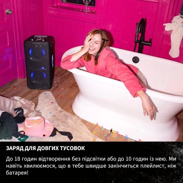 Підготовка до DJ-сету займає лічені хвилини: міцні коліщата, зручна ручка та повне керування через додаток роблять переміщення та налаштування максимально комфортними. Колонка легко їде за вами, куди б не занесла ніч — танцюйте хоч сальсу на пляжі, хоч мамбу на даху.