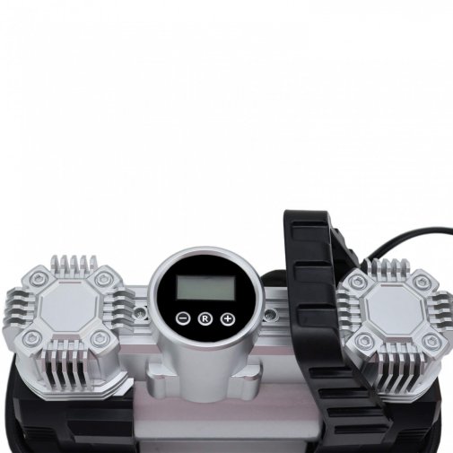 Пристрій живиться від акумулятора через «крокодили» або від прикурювача 12 В, довгий кабель і повітряний шланг дають змогу дістати до будь-якого колеса без перенесення компресора. Великий аналоговий манометр з чіткою шкалою та функція автостопу гарантують точне накачування без ризику перекачати шину — компресор сам вимкнеться при досягненні заданого тиску.