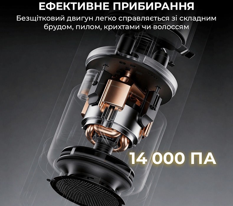 Основою пристрою є безщітковий двигун потужністю 80 Вт, який забезпечує стабільну роботу та високу ефективність очищення. При щільному приляганні насадки до поверхні пилосос здатний витягувати забруднення не лише з поверхні, а й із глибших шарів тканини, що особливо корисно для автомобільних сидінь і м’яких меблів.