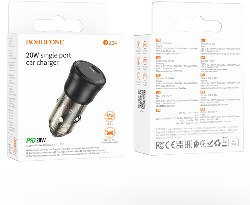 BOROFONE BZ24 Clever — це сучасний автомобільний зарядний пристрій з портом USB Type-C, потужністю 20 Вт, який ідеально підходить для швидкої зарядки гаджетів у дорозі.