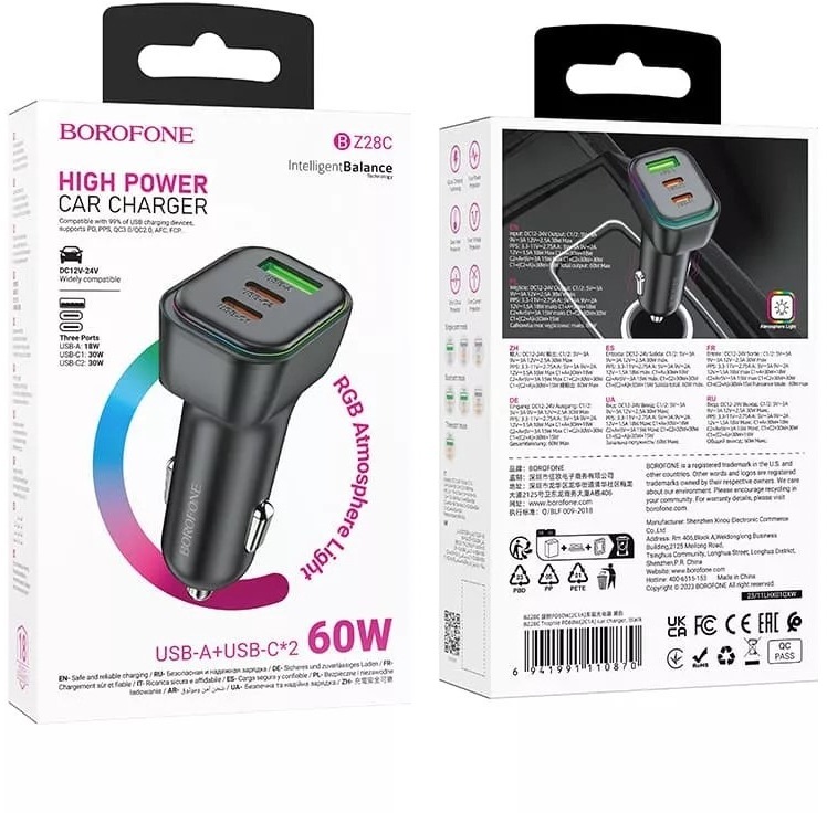 Стильне RGB-підсвічування додає сучасності дизайну та полегшує використання в темряві. BOROFONE BZ28C Trophie — це надійне рішення для водіїв, які потребують швидкої та одночасної зарядки кількох пристроїв у дорозі.