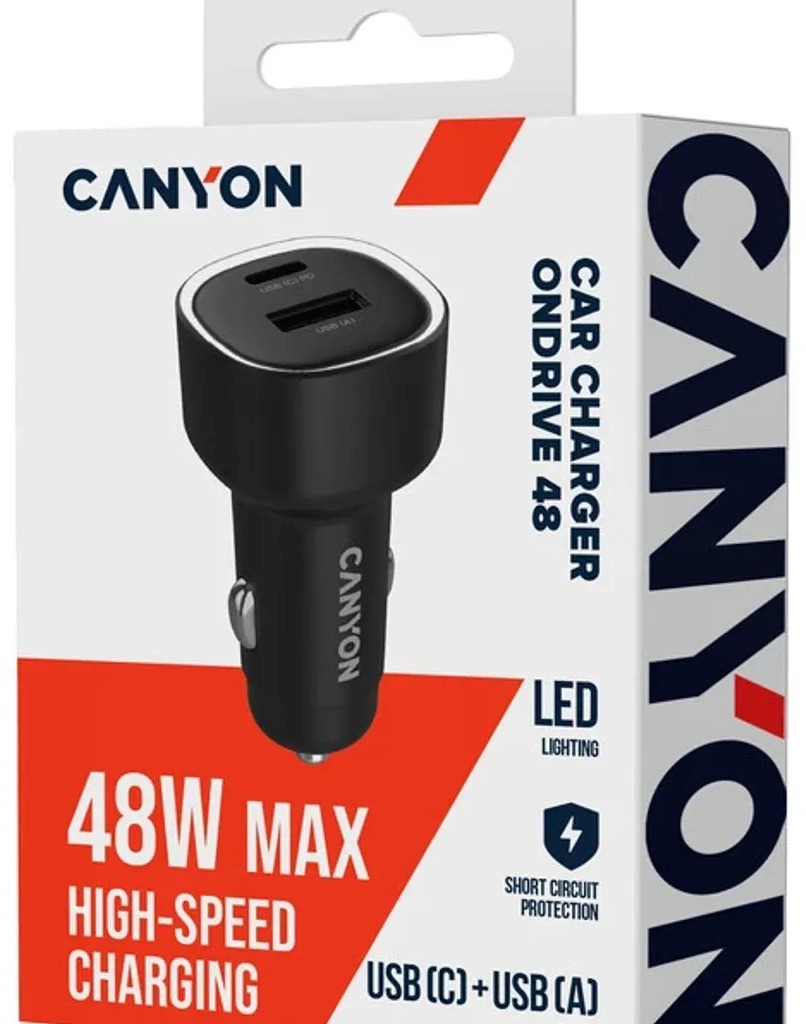 Автомобільний зарядний пристрій Canyon OnDrive 48 є компактним і потужним рішенням для зарядки гаджетів у дорозі. Цей пристрій, виготовлений у чорному кольорі з міцного полікарбонатного корпусу, забезпечує загальну вихідну потужність до 48 Вт, дозволяючи одночасно заряджати два пристрої. Він ідеально підходить для сучасних смартфонів, планшетів та навігаційних систем, роблячи поїздки комфортнішими без ризику розрядки батареї. Завдяки портативному формфактору та простоті підключення до автомобільного прикурювача, OnDrive 48 стає незамінним аксесуаром для активних водіїв.