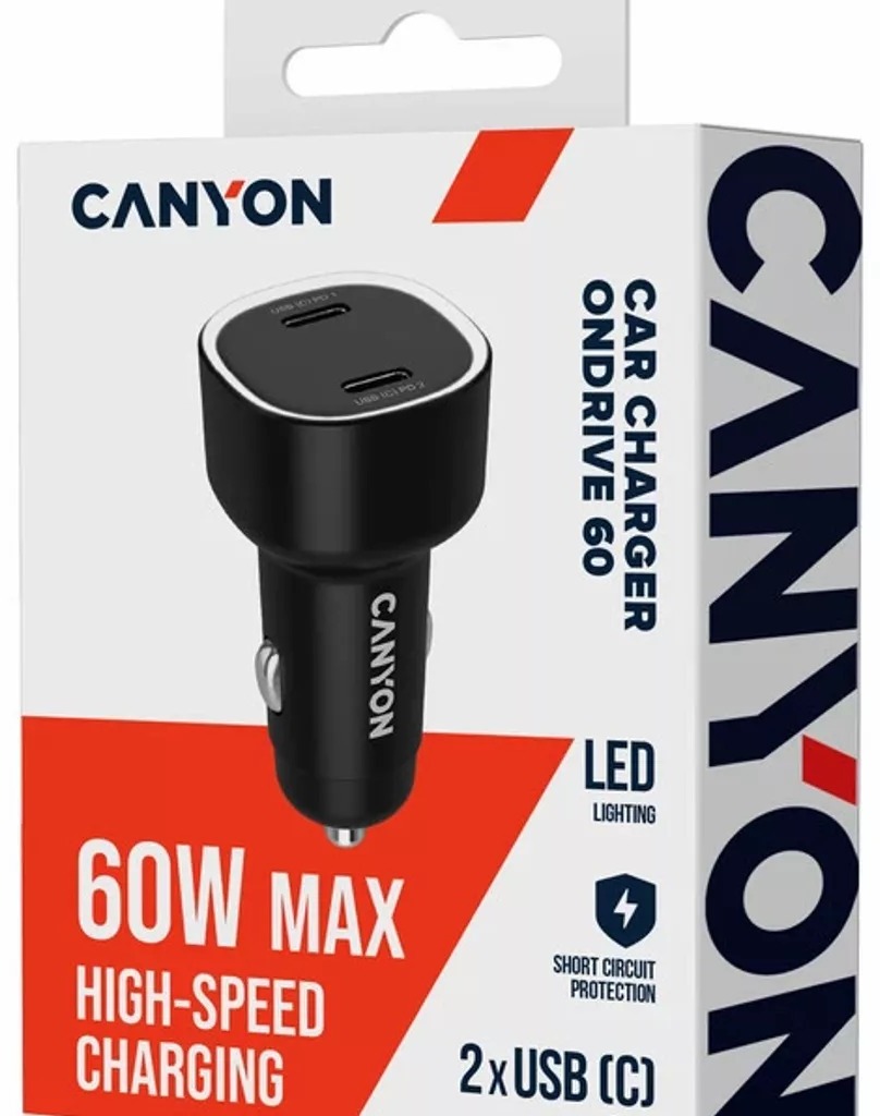 Автомобільний зарядний пристрій Canyon OnDrive 60 — це надійний помічник для тих, хто постійно в дорозі. Цей компактний гаджет поєднує в собі професійну продуктивність і зручний портативний дизайн, дозволяючи швидко заряджати смартфони, планшети чи навіть ноутбуки прямо від прикурювача автомобіля. З чорним корпусом з міцного полікарбонату, пристрій легко поміщається в кишеню чи бардачок, не займаючи зайвого місця. Його ключова перевага — два USB-C порти, які забезпечують одночасну зарядку двох пристроїв, роблячи поїздки комфортнішими без необхідності зупинятися для пошуку розеток.