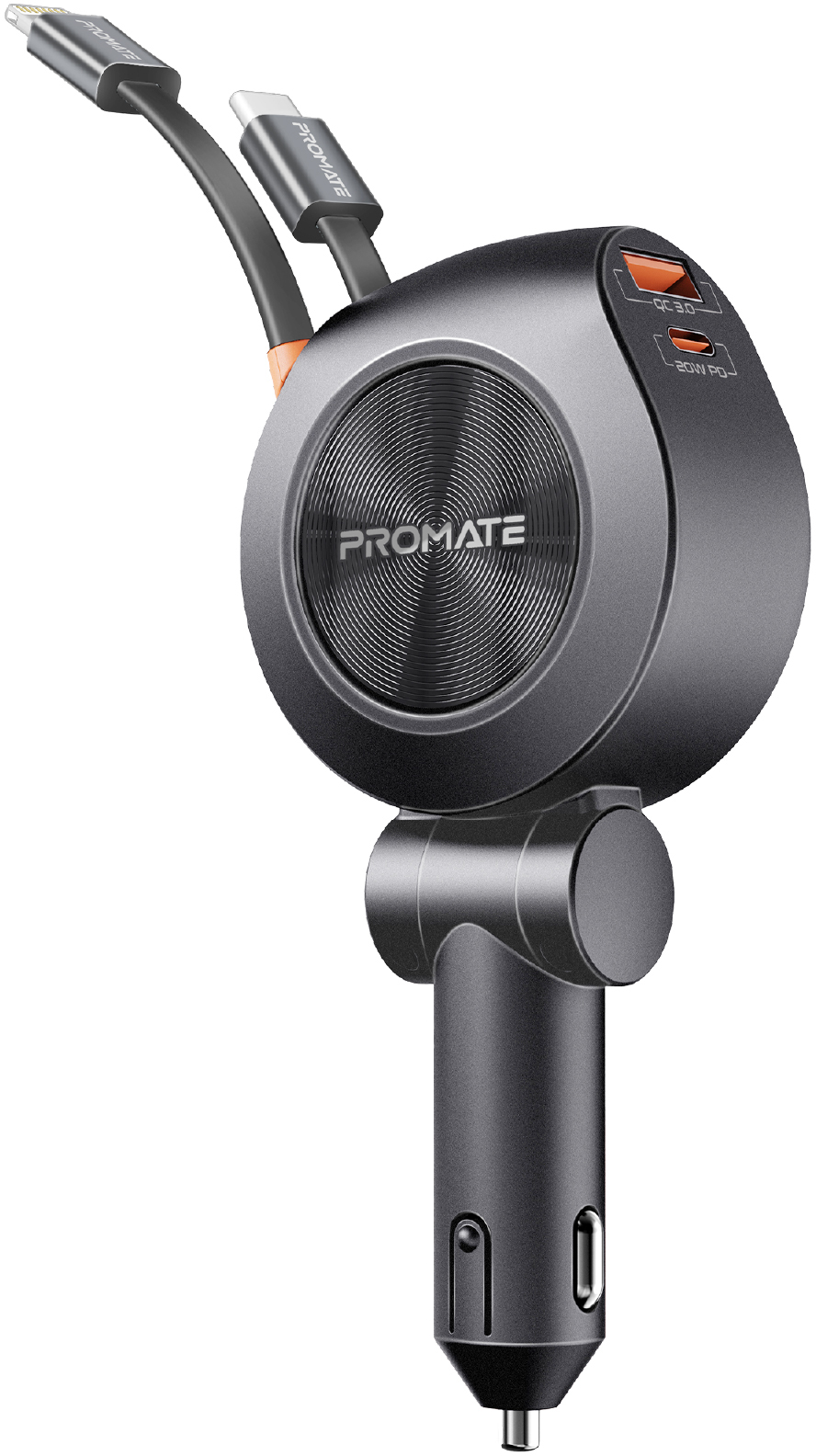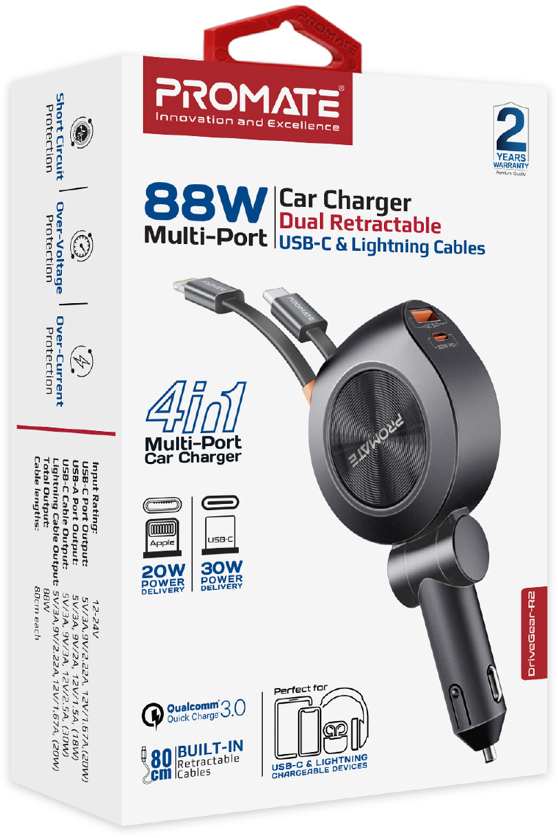 DriveGear-R2 від Promate — стильний та потужний автомобільний зарядний пристрій із преміальних матеріалів. Швидко та легко зарядить 4 пристрої одночасно на сумарній потужності в 88W.