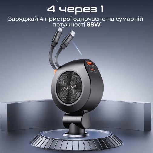 Заряджай 4 пристрої одночасно на сумарній потужності 88W.