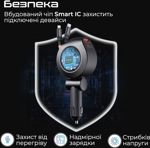 Вбудований чіп Smart IC захистить підключені девайси від перегріву, стрибків напруги, короткого замикання та надмірного заряджання.