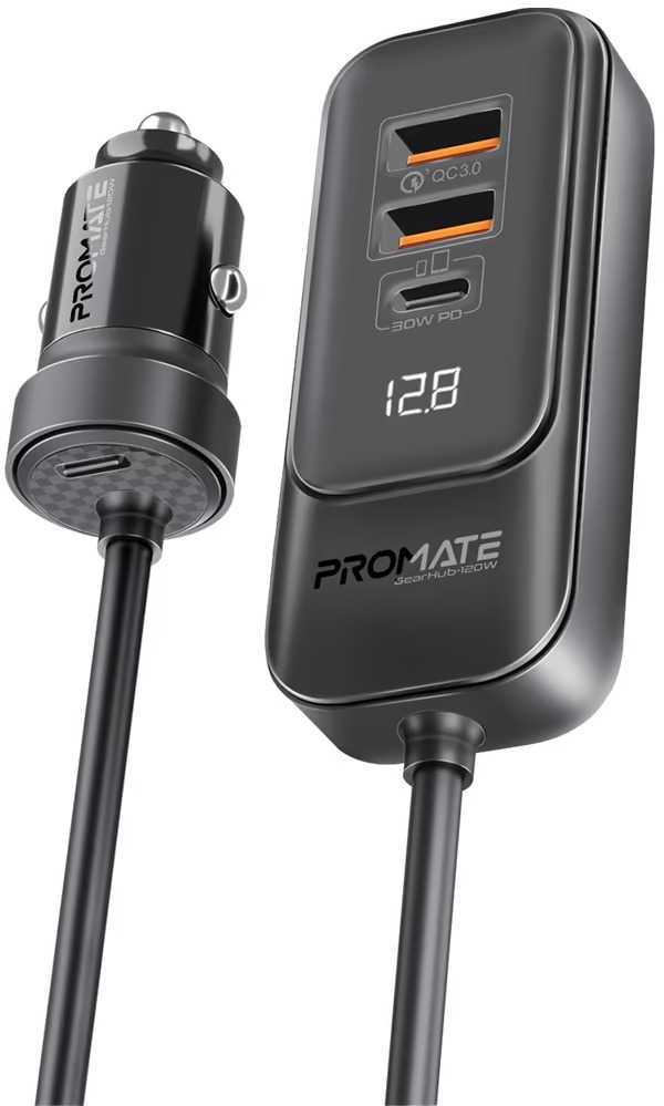 Автомобільний зарядний пристрій Promate GearHub-120W перетворює поїздки на комфортні та продуктивні, дозволяючи заряджати до чотирьох пристроїв одночасно з сумарною потужністю 120 Вт. Цей компактний гаджет з вбудованим USB-C портом у прикурювач та розширювачем забезпечує зручний доступ для водія, переднього та задніх пасажирів, усуваючи потребу в довгих подовжувачах чи обмежену кількість розеток.