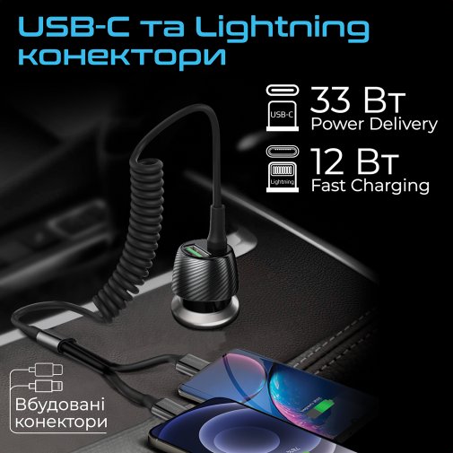 Promate PowerDrive-33PDCi — ідеальне рішення для швидкого та ефективного заряджання твоїх пристроїв у машині. А вбудовані спіральні USB-C і Lightning кабелі оптимізують простір в авто та позбавлять від необхідності купівлі додаткових дротів.