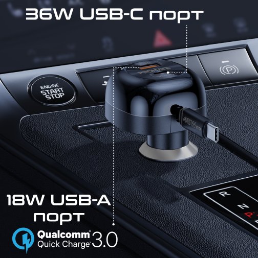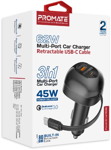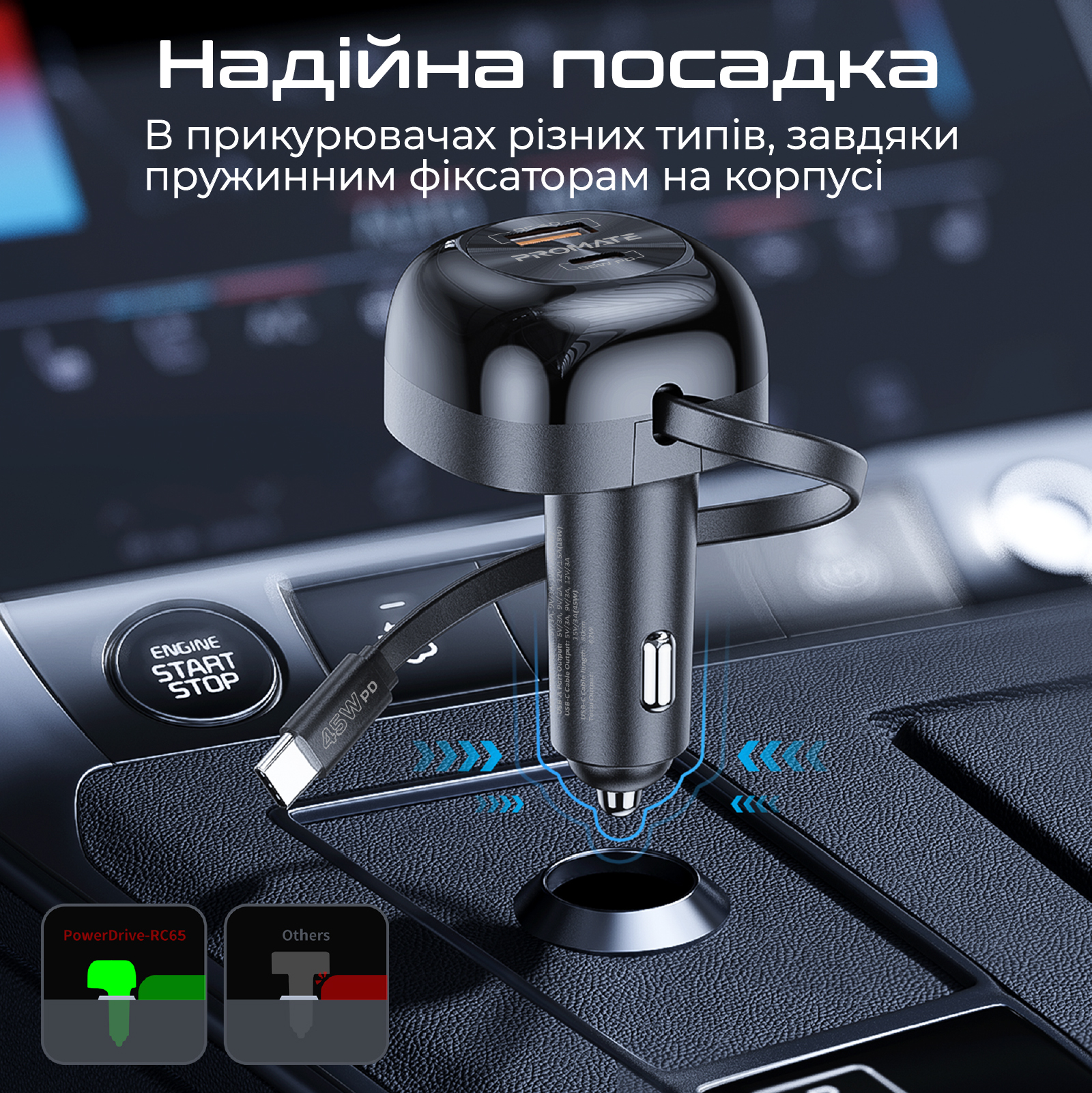 Promate PowerDrive-RC65- ідеальне рішення для швидкого та ефективного заряджання твоїх пристроїв у машині. А вбудований кабель оптимізує простір в авто та позбавить від необхідності купівлі додаткового дроту.