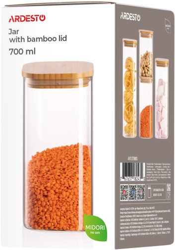 Банка ARDESTO серії Midori – це стильне рішення для зберігання цукру, спецій або інших сипучих продуктів. Квадратну банку об’ємом 700 мл виготовлено з екологічного боросилікатного скла, яке не вбирає запахи, кришка з бамбуку створює герметичне паковання. Виріб можна мити в посудомийній машині (крім бамбукової кришки).