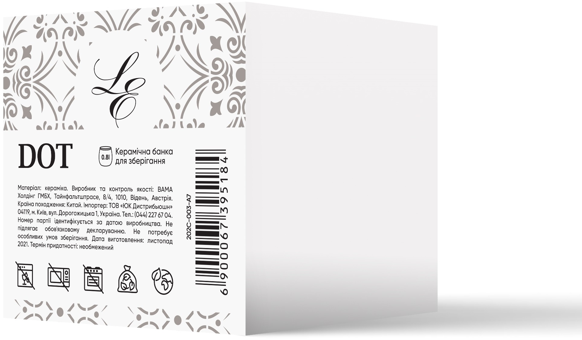 До колекції DOT входять керамічні банки нейтрального сірого кольору, який гармонійно поєднується з безліччю різноманітних відтінків, у 2 об’ємах: 0,8 л і 1,9 л. Банки великого об’єму відмінно підійдуть для зберігання як сипучих продуктів, так і різноманітних смаколиків (печива, цукерок та ін.).