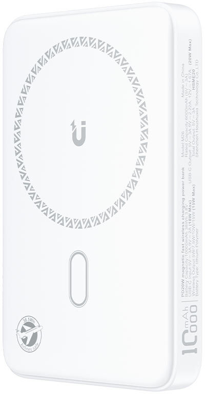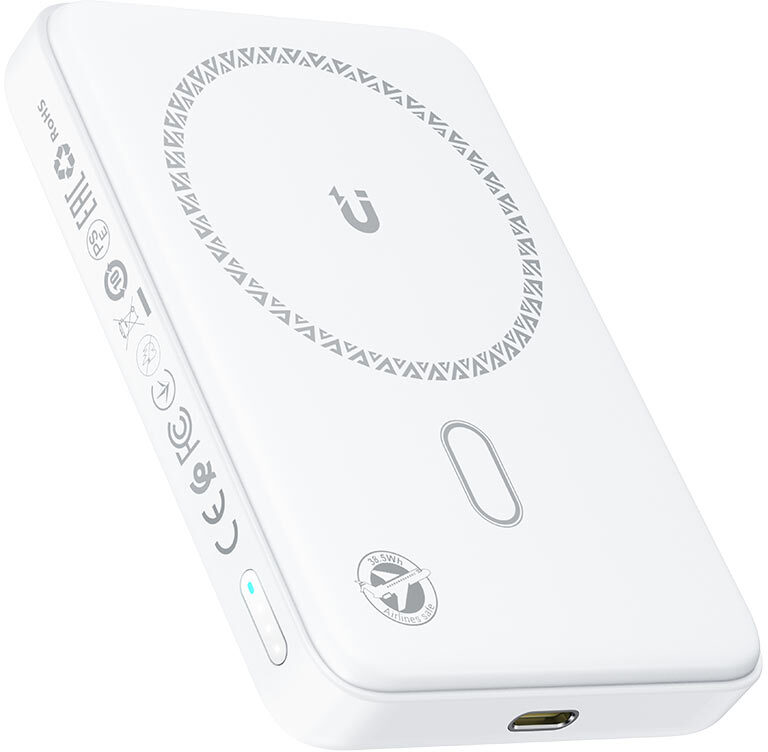 При розмірах 107 х 70 х 17,7 мм і вазі лише 200 г M26 легко поміщається у кишеню або невелику сумку. Біла версія виглядає лаконічно й сучасно. LED-індикатор на корпусі в реальному часі відображає рівень заряду самого павербанка та стан бездротового заряджання. Пристрій пройшов міжнародну сертифікацію: FCC, CE, RoHS, EAC та UN38.3 — що підтверджує його безпеку та відповідність стандартам якості.