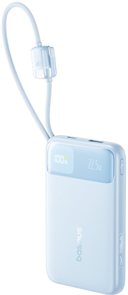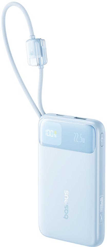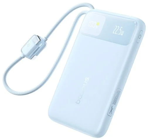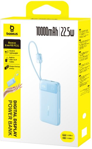 Baseus EnerFill FC11 — це павербанк місткістю 10 000 мАг із підтримкою швидкої зарядки до 22,5 Вт, цифровим дисплеєм і двома вбудованими плетеними кабелями, що дозволяє заряджати пристрої без жодного зовнішнього кабелю в кишені чи сумці.