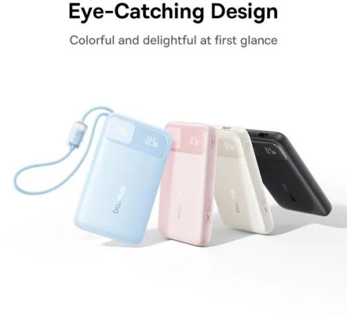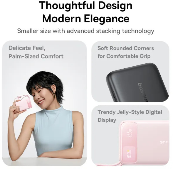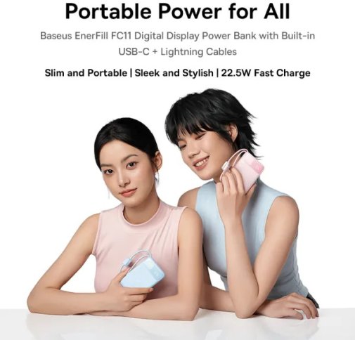 Baseus EnerFill FC11 — це павербанк місткістю 10 000 мАг із підтримкою швидкої зарядки до 22,5 Вт, цифровим дисплеєм і двома вбудованими плетеними кабелями, що дозволяє заряджати пристрої без жодного зовнішнього кабелю в кишені чи сумці.