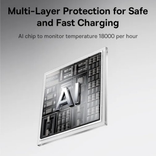 Головна перевага цієї моделі — два вбудовані кабелі: один USB-C і один Lightning, обидва виконані з надміцного нейлонового плетіння. Це означає сумісність і з сучасними Android-пристроями, і з iPhone 14 та старшими моделями Apple одночасно, без необхідності шукати окремий провід. Крім вбудованих кабелів, пристрій також має порти USB-C і USB-A — отже, до чотирьох пристроїв можна заряджати одночасно.