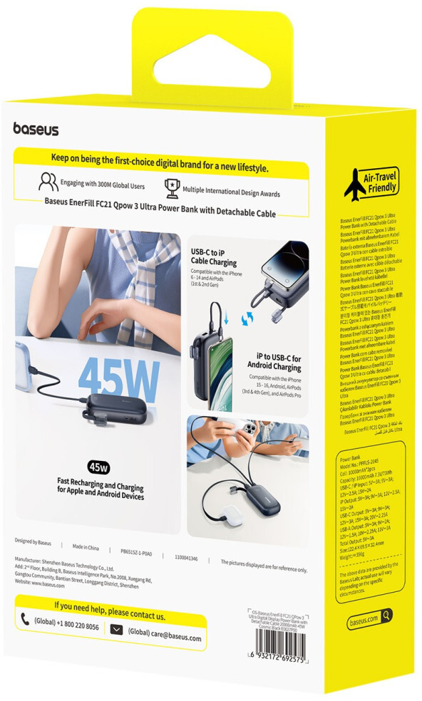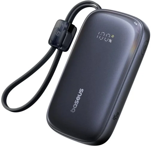 Швидка зарядка 45 Вт прискорює процес відновлення енергії, а чіткий цифровий дисплей показує точний рівень заряду у відсотках, допомагаючи планувати день. Літій-полімерний акумулятор гарантує стабільність і довговічність, а компактні розміри з пластиковим корпусом поєднують стиль і практичність.
