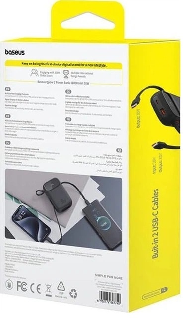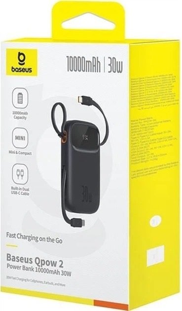 Baseus QPow 2 — це компактний, але надзвичайно місткий павербанк, створений для тих, хто цінує швидкість і зручність. Завдяки вбудованим двом кабелям Type-C ви забуваєте про пошук дротів: просто дістаєте потрібний і заряджаєте смартфон, планшет чи навушники одним рухом.