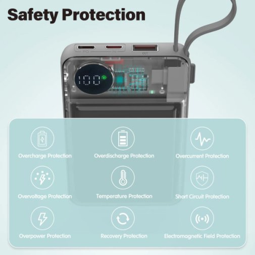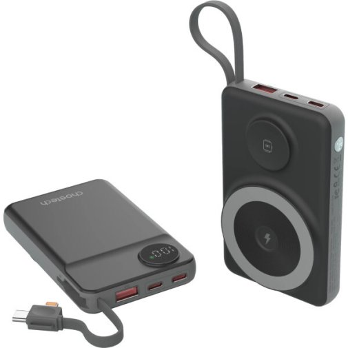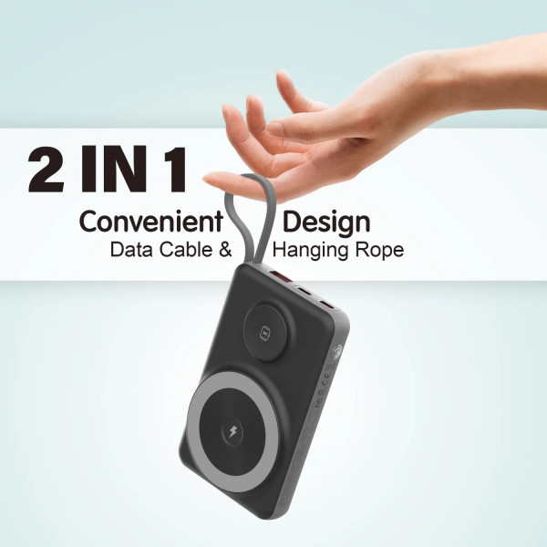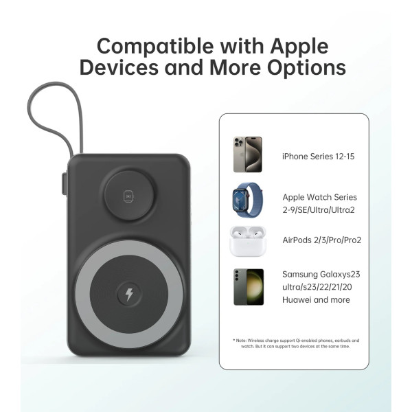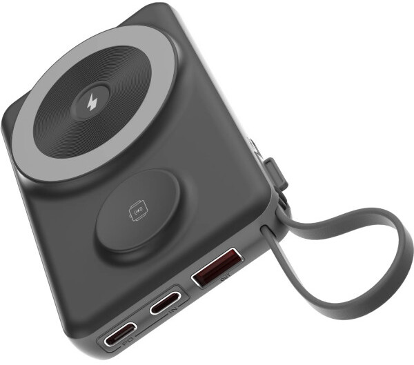 Пристрій підтримує магнітну бездротову зарядку смартфона потужністю до 15W та зарядку Apple Watch потужністю 2,5W. Для дротового підключення передбачено порт USB-C і USB-A, а також вбудований кабель із роз'ємами Type-C та Lightning — він завжди під рукою і не потребує окремого носіння. Вихідна потужність через USB-C сягає 22.5W із підтримкою Power Delivery, а через USB-A — до 18W із підтримкою QC3.0, що забезпечує швидке заряджання сумісних пристроїв.