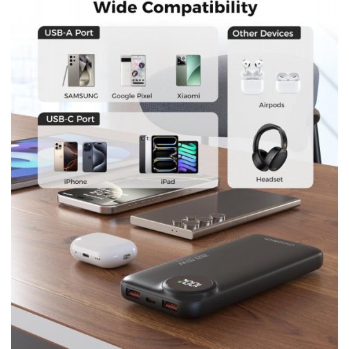 Choetech B791 — це тонка та легка портативна батарея місткістю 10 000 мАг, яка підтримує швидку зарядку потужністю 22,5W з функцією Power Delivery. Цього запасу енергії достатньо, щоб повністю зарядити більшість сучасних смартфонів двічі-тричі, забезпечуючи надійне живлення протягом усього дня.