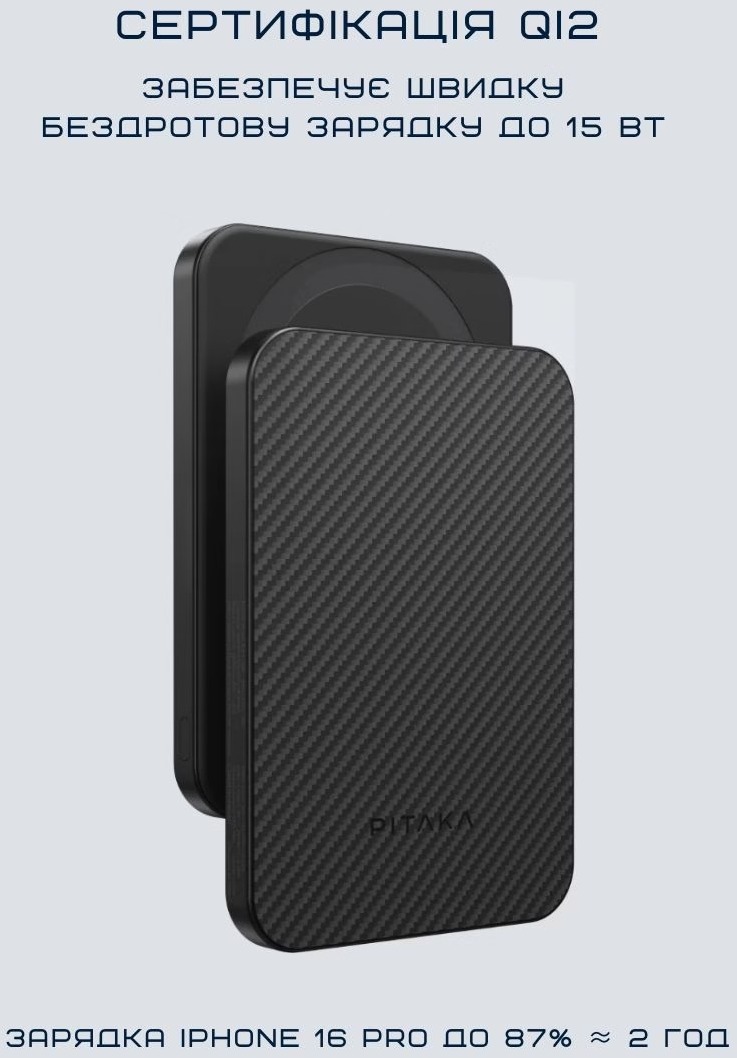 Універсальна батарея Pitaka Aramid Fiber Magnetic Qi2 — це справжній преміальний магнітний павербанк, який перетворює зарядку iPhone на елегантний і миттєвий ритуал: просто під'єднав — і телефон оживає, залишаючись у твоїх руках для дзвінків, відео чи ігор без жодних кабелів.