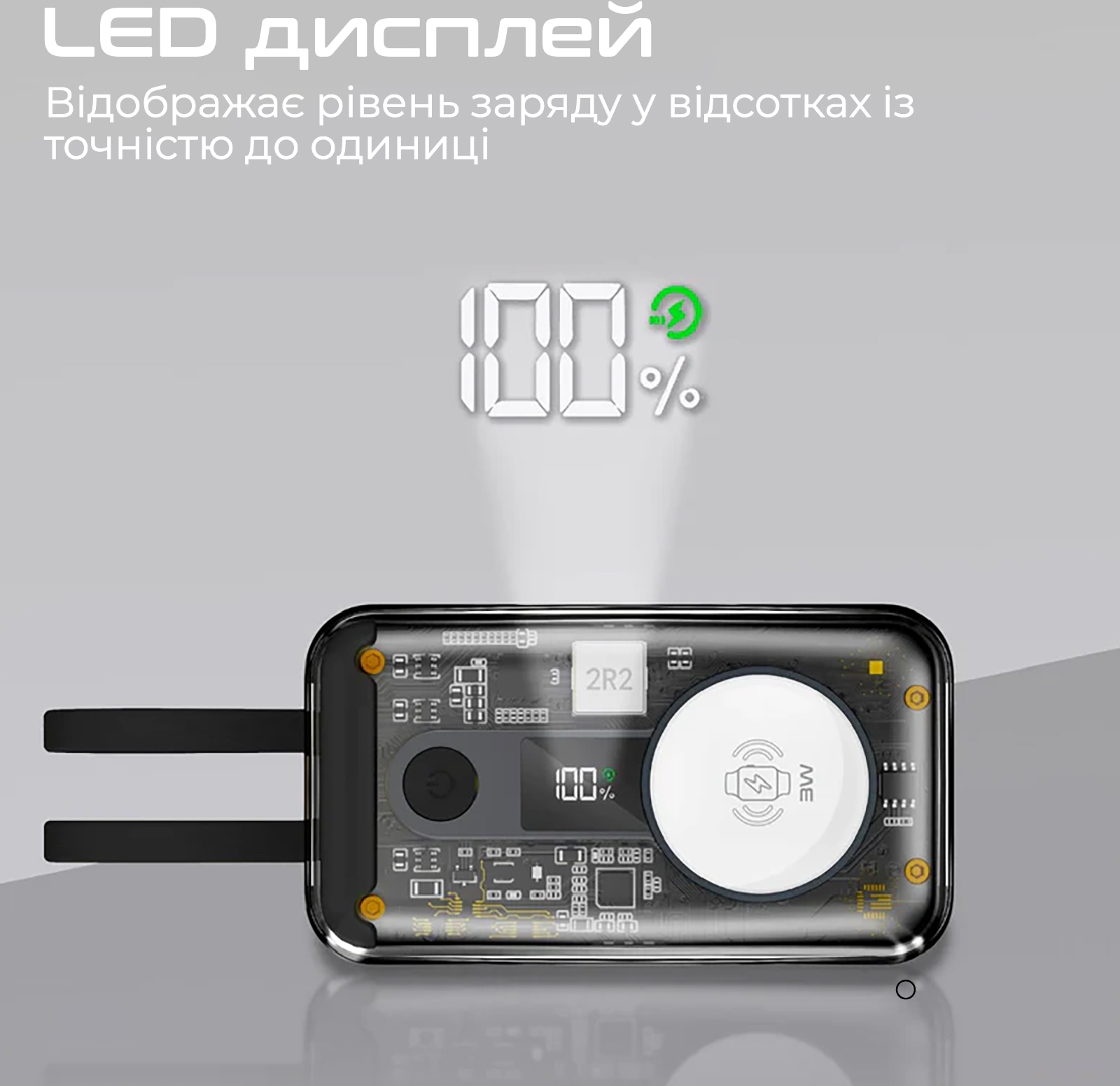 - LED дисплей: Відображає рівень заряду у відсотках з точністю до одиниці.
