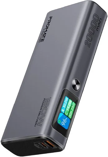 Titan-130 від Promate - потужний павербанк на 20 000 mAh з підтримкою 20 Вт Power Delivery і 30 Вт Quick Charge 3.0, швидко зарядить твої пристрої. А металевий корпус і LED дисплей додадуть практичності в повсякденному використанні.