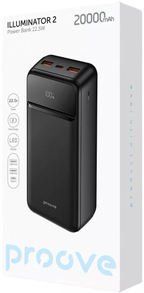 Proove Illuminator 2 — потужна універсальна батарея, оснащена LED-дисплеєм для відображення поточного рівня заряду, одним роз'ємом USB Type-C та двома USB Type-A. Потужність пристрою 22,5 Вт гарантує швидке відновлення енергії, а місткості моделі на 20 000 мАг вистачить для тривалого використання без необхідності постійного заряджання. Павербанк підтримує сучасні протоколи швидкого заряджання, забезпечуючи ефективну та безпечну подачу енергії.