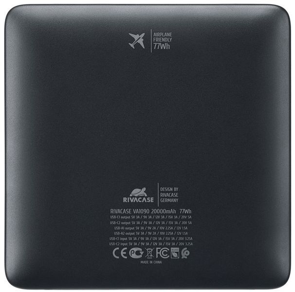 RivaCase RivaPower VA1090 20000 mAh — це потужний портативний акумулятор преміального рівня від бренду RivaCase, розроблений для тих, кому мало зарядити смартфон і хто хоче тримати в рюкзаку повноцінне джерело живлення для ноутбука, планшета та кількох ґаджетів одночасно. Головна відмінність цієї моделі від більшості конкурентів — підтримка Power Delivery з вихідною потужністю до 100 Вт при напрузі до 20 В, що робить її сумісною навіть з вимогливими пристроями на кшталт MacBook Air, якого вона здатна зарядити до повного заряду один раз.