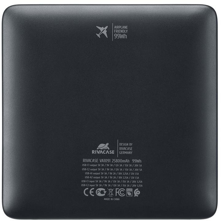 RivaCase RivaPower VA1091 — це максимальна місткість у межах авіаційних норм у поєднанні з повноцінною потужністю 100 Вт для ноутбуків. Він пропонує великий запас енергії при мінімальному розмірі, що робить його очевидним вибором для тривалих відряджень, подорожей і ситуацій, коли розетка може бути недоступна годинами.