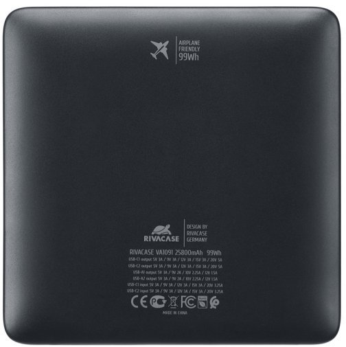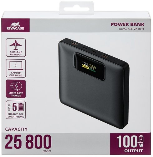RivaCase RivaPower VA1091 25800 mAh — це флагманська модель у лінійці портативних акумуляторів RivaCase, що поєднує максимальну місткість, повноцінну підтримку Power Delivery 100 Вт і надзвичайно плаский для свого класу корпус. Це пристрій для тих, хто не готовий іти на компроміс між автономністю і мобільністю.