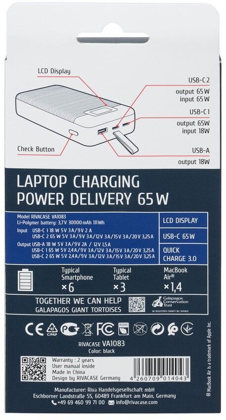 Батарея універсальна RivaCase RivaPower VA1083 — це потужний портативний зарядний пристрій, призначений для швидкої зарядки смартфонів, планшетів, ноутбуків та інших ґаджетів. Він поєднує високу місткість, сучасні протоколи швидкої зарядки та міцний дизайн, ідеально підходячи для тривалих подорожей, роботи чи активного використання.