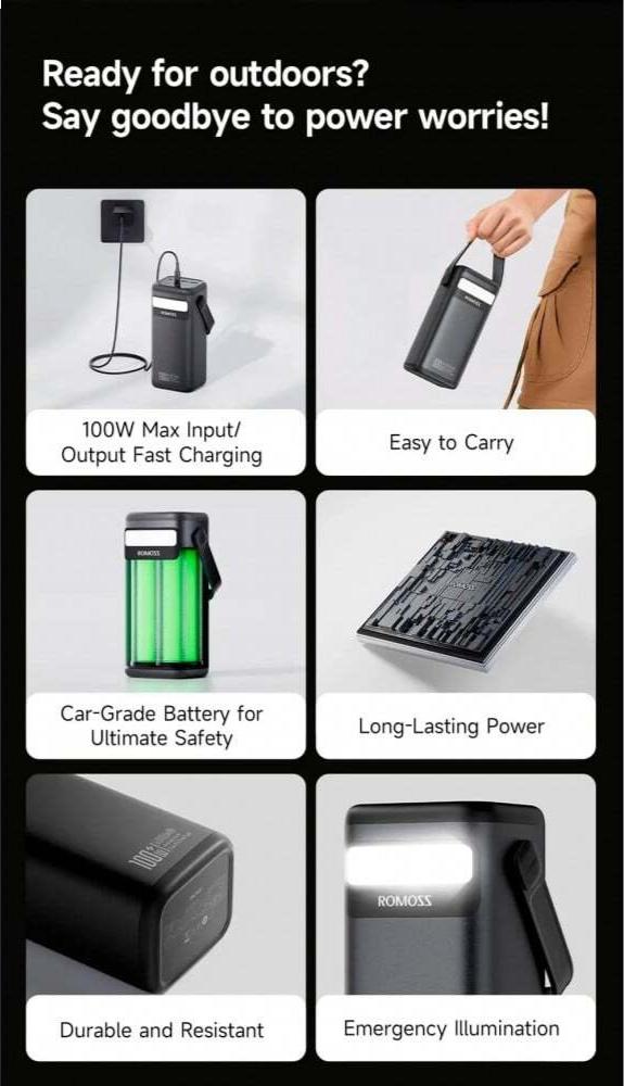 Універсальна батарея Romoss PMT60 є потужним і надійним портативним джерелом енергії, розробленим для користувачів, які потребують високої місткості та швидкої зарядки в умовах обмеженого доступу до мережі, таких як довгі поїздки, кемпінг чи екстрені ситуації, забезпечуючи безперервну роботу ґаджетів без компромісів у безпеці чи ефективності.
