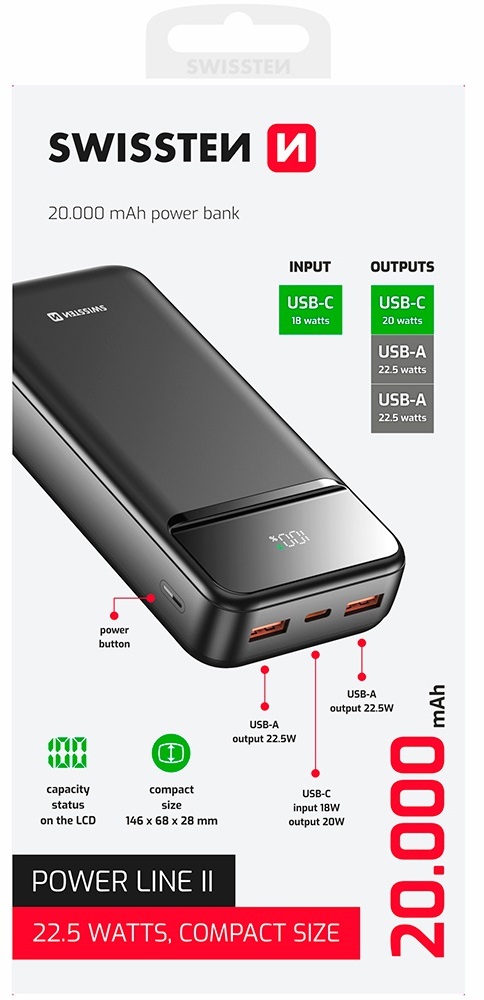 Універсальна мобільна батарея SWISSTEN Power Line II — це потужний і надійний помічник, який не залишить вас без зв’язку навіть у найдовшій подорожі чи активному робочому дні. З місткістю 20 000 мАг цей повербанк легко забезпечить кілька зарядів сучасного смартфона, планшета або навіть смартгодинника, дозволяючи забути про розетку на кілька діб.