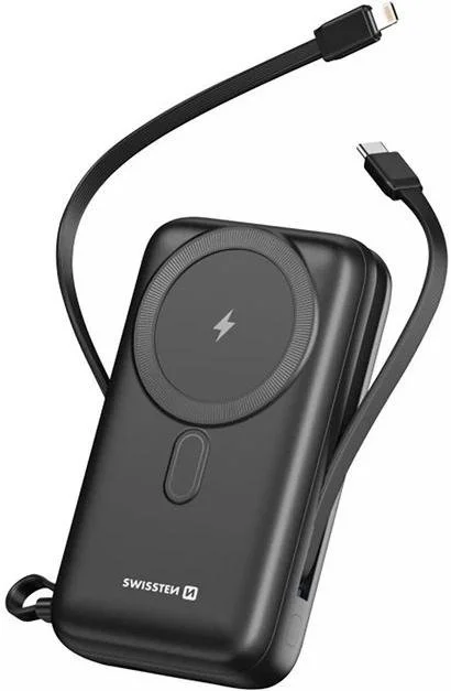 SWISSTEN Power Bank — це універсальний і зручний зовнішній акумулятор, сумісний з MagSafe, який ідеально підходить для власників iPhone та інших пристроїв. Завдяки інтегрованим кабелям USB-C і Lightning ви забудете про необхідність носити окремі зарядні шнури, а магнітне кріплення забезпечує точне і швидке бездротове заряджання.