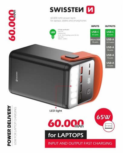 Swissten Power Line Powerbank з місткістю 60 000 мАг — це потужний портативний зарядний пристрій, який ідеально підходить для тривалих поїздок, роботи на виїзді чи повсякденного використання, коли доступ до розетки обмежений. Цей чорний powerbank дозволяє заряджати смартфони, планшети та навіть ноутбуки без перерв, забезпечуючи швидку подачу енергії на рівні 65 Вт. Завдяки підтримці технології Power Delivery, він оптимізує процес зарядки для різних пристроїв, дозволяючи одночасно живити кілька гаджетів. Компактний дизайн з петлею для кріплення робить його зручним у транспортуванні, а вбудований ліхтарик з двома режимами яскравості та функцією SOS додає практичності в екстрених ситуаціях.