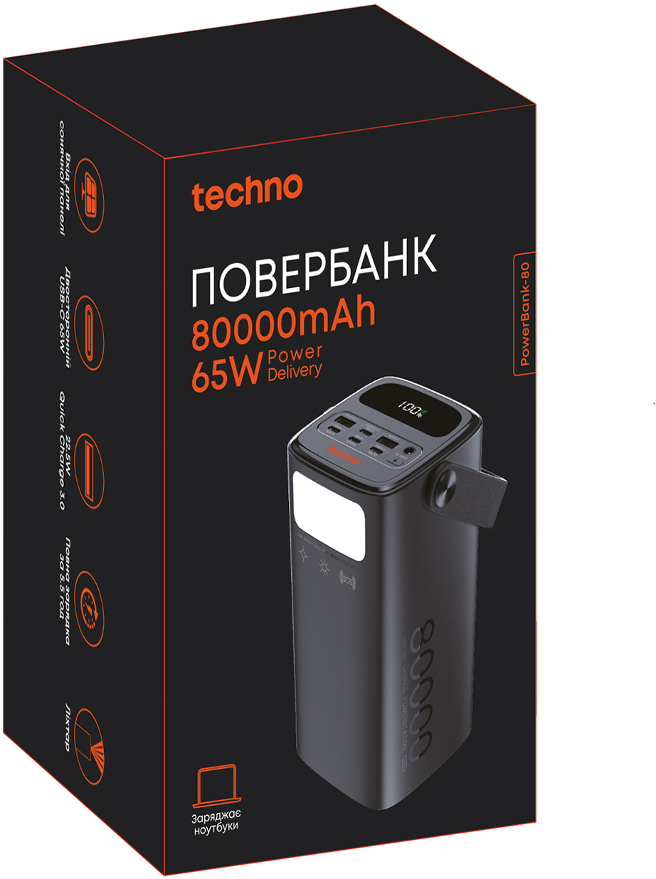 80 000 mAh, 65W сумарної вихідної потужності, підтримка технологій Power Delivery і Quick Charge 3.0, USB-C/USB-A порти та LED ліхтарик. PowerBank-80 від Techno- потужний павербанк, який з легкістю зарядить будь-який Type-C ноутбук.
