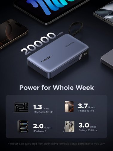 Модель має місткість 20 000 мАг, що дає можливість кілька разів повністю зарядити смартфон або підтримувати роботу ноутбука протягом дня. Максимальна вихідна потужність сягає 145 Вт, а через порт USB-C пристрій підтримує швидку зарядку до 100 Вт. Це дозволяє швидко відновлювати заряд потужних пристроїв, включаючи MacBook, ультрабуки та ігрові ноутбуки з USB-C.