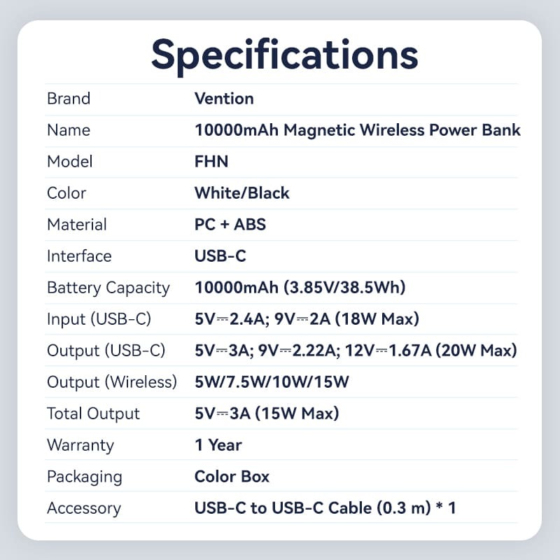 Батарея універсальна Vention FHNW0 10000mAh 20W/Qi — це потужний і зручний портативний пристрій для тих, хто потребує надійного джерела енергії в дорозі. Її магнітна конструкція забезпечує ідеальне прилягання до сумісних смартфонів, роблячи зарядку простою та стабільною без зайвих зусиль.