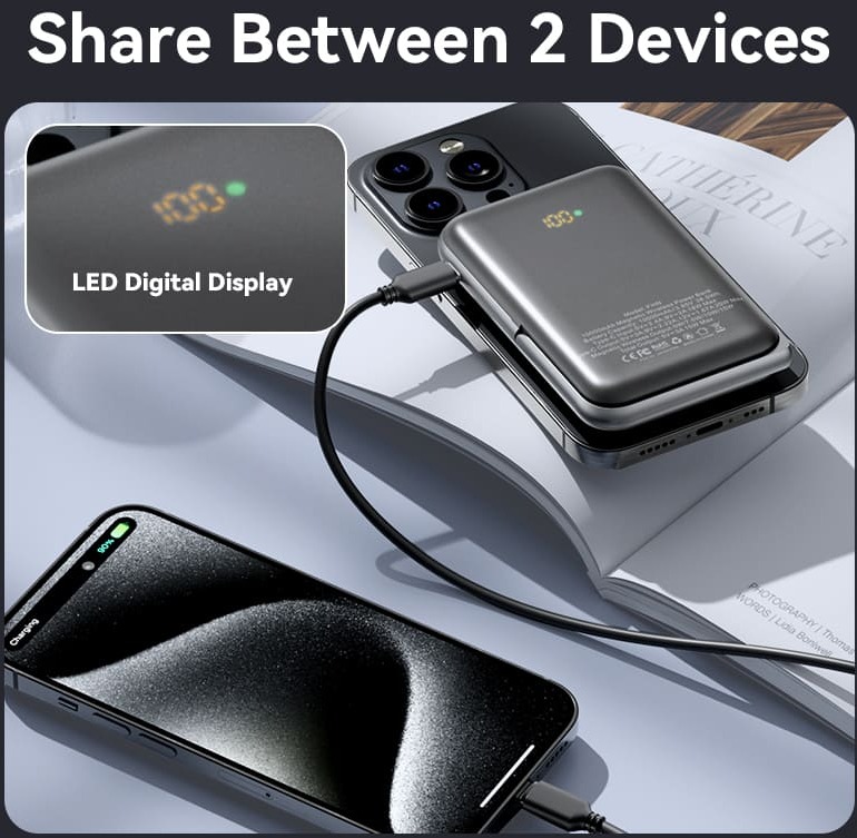 Особливо привабливою є функція магнітної бездротової зарядки, яка дозволяє просто приєднати павербанк до задньої панелі телефону для автоматичного початку процесу. Це ідеально підходить для власників iPhone з MagSafe або інших пристроїв з підтримкою Qi, забезпечуючи зручність без кабелів і свободу рухів під час зарядки.
