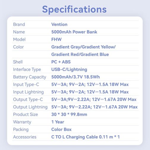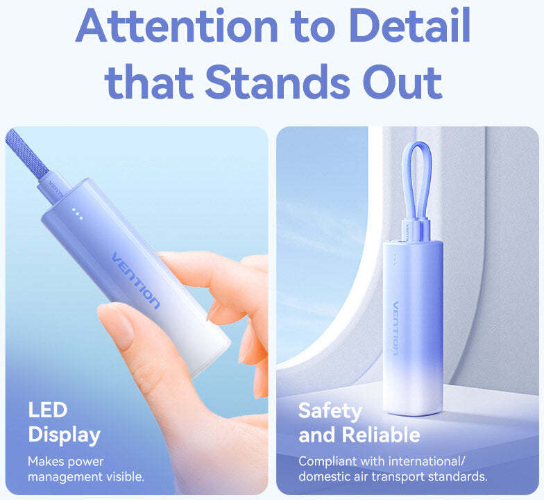 Vention поєднує в собі портативність, швидку зарядку та практичний дизайн із вбудованим кабелем, пропонуючи надійне та стильне рішення для тих, хто веде активний спосіб життя. Це ідеальний компаньйон для подорожей, роботи чи повсякденності, коли потрібно завжди залишатися на зв’язку.