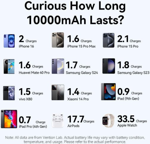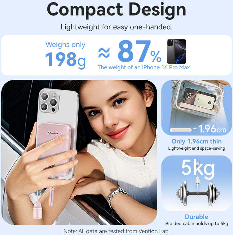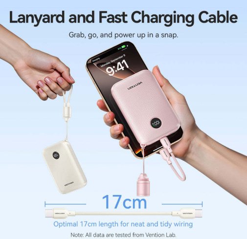 У яскравому матовому корпусі з soft-touch покриттям вона виглядає лаконічно й сучасно, ніби продовження твого смартфона. Місткість 10 000 мАг — це реально 2–2.5 повних заряди iPhone чи Android, або один заряд планшета чи навіть MacBook Air на 50–60 % через Type-C PD 22.5 Вт. Найголовніше — вбудований кабель USB-C, який завжди з тобою: витягуєш з бокового слота, підключаєш і заряджаєш будь-який Type-C ґаджет без пошуку дроту.