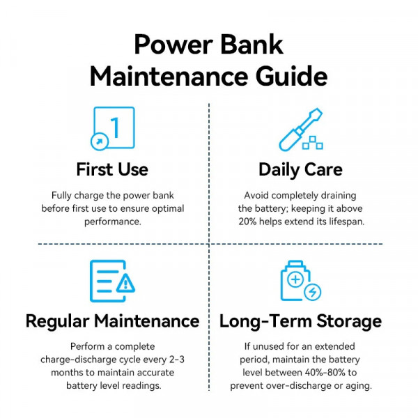 Повербанк обладнаний двома портами — USB-A та USB-C — які працюють одночасно: перший забезпечує потужність до 22,5 Вт, другий — до 20 Вт. У режимі одночасної зарядки двох пристроїв загальна потужність становить 15 Вт. Порт USB-C також підтримує двостороннє швидке заряджання із максимальною потужністю 18 Вт, тобто сам повербанк можна заряджати швидко через той самий роз'єм. Вбудований світлодіодний дисплей відображає рівень заряду у відсотках, тож завжди зрозуміло, скільки енергії залишилось. Пристрій захищений від короткого замикання, перегрівання та перезаряджання.