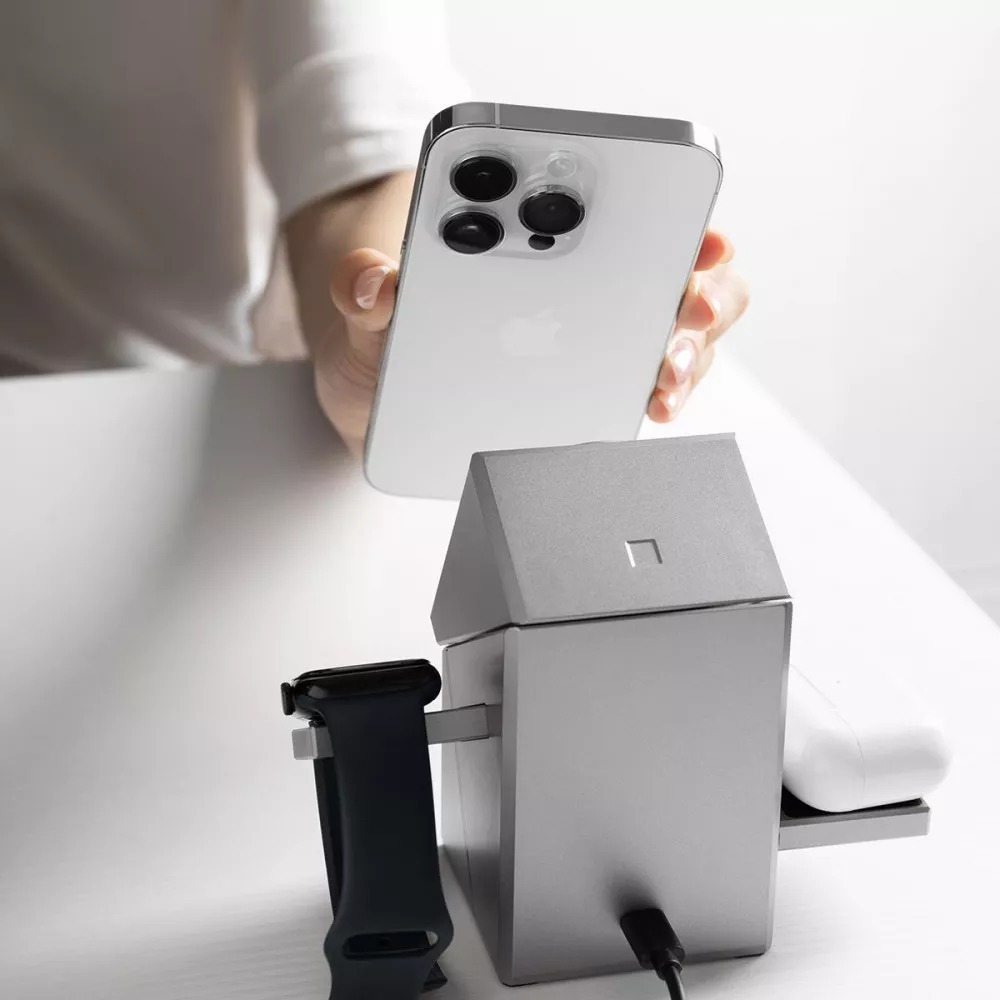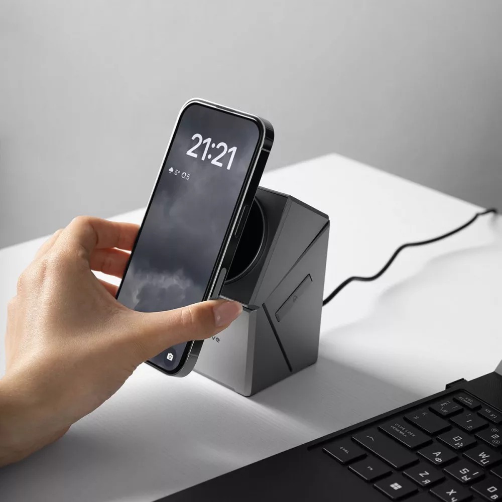 Центральне місце займає зона бездротового заряджання для смартфона з підтримкою стандарту Qi2 та потужністю до 15W. Вбудовані магніти на основі технології Magnetic Ring забезпечують точне позиціювання iPhone з MagSafe або будь-якого Qi2-сумісного пристрою — без ручного вирівнювання. Поворотний механізм дозволяє регулювати кут нахилу смартфона, зокрема встановлювати його горизонтально для перегляду відео або для функції StandBy в iOS 17. Додаткові платформи для навушників і смартгодинника висуваються натисканням і забезпечують вихідну потужність по 2.5W — усі три пристрої заряджаються одночасно, не заважаючи одне одному.